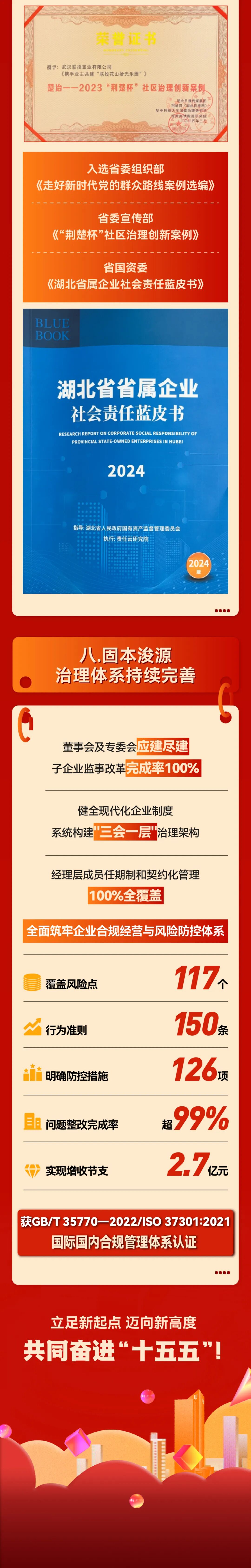 “十四五”以來,湖北聯(lián)投以黨的科學(xué)理論為炬,在省委省政府的堅強領(lǐng)導(dǎo)下,在省政府國資委的關(guān)心指導(dǎo)下,堅持思想向支點聚焦,力量向支點集中,行動向支點發(fā)力,從產(chǎn)業(yè)園區(qū)中“鏈的聚勢”到“群的躍升”,從城市發(fā)展中的街巷“更新”到生活“煥新”,從工程建設(shè)的“單兵作戰(zhàn)”到“全鏈競逐”,從“兩山”實踐中的“生態(tài)包袱”到“綠色財富”,從首進“中國企業(yè)500強”并持續(xù)躍升至180位,到實現(xiàn)資產(chǎn)規(guī)模、營收利稅翻番……每一天都是新跨越,每一步都有新風(fēng)采。