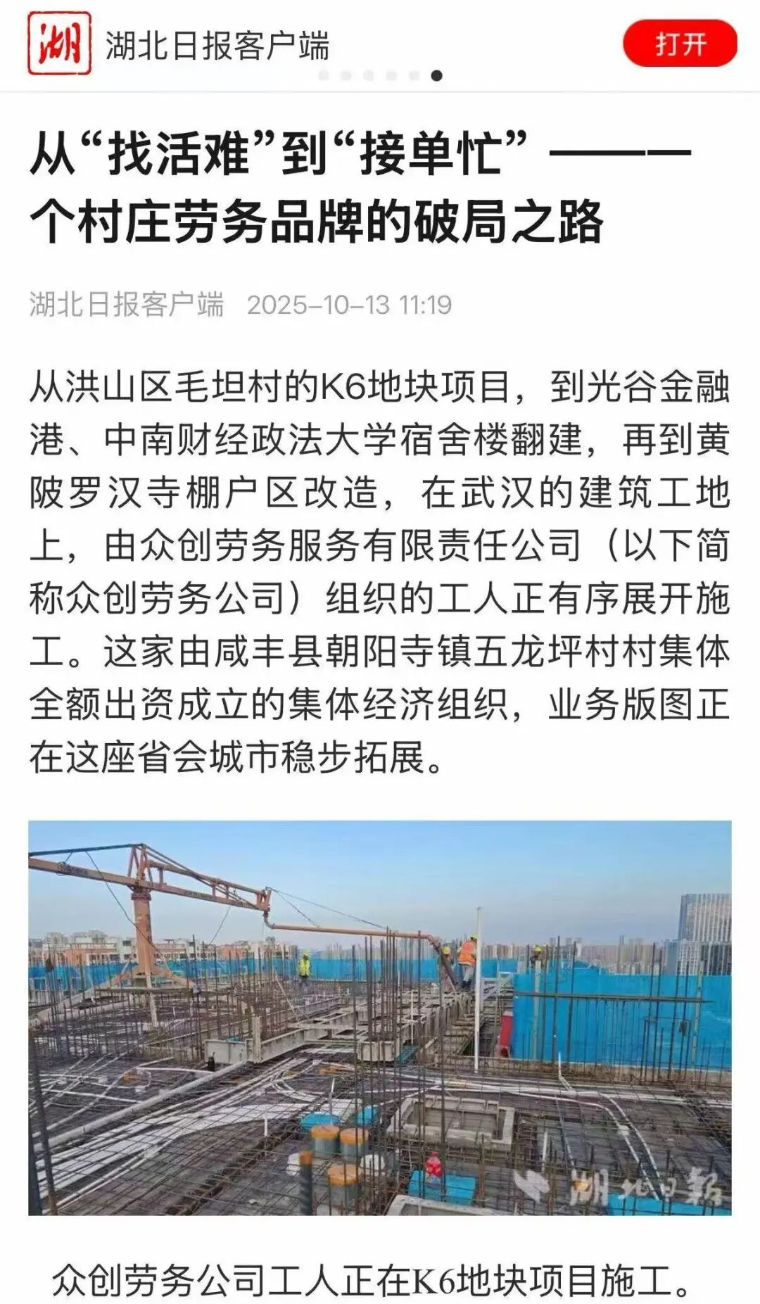 從洪山區(qū)毛坦村的K6地塊項目,到光谷金融港、中南財經(jīng)政法大學宿舍樓翻建,再到黃陂羅漢寺棚戶區(qū)改造,在武漢的建筑工地上,由眾創(chuàng)勞務(wù)服務(wù)有限責任公司(以下簡稱眾創(chuàng)勞務(wù)公司)組織的工人正有序展開施工。這家由咸豐縣朝陽寺鎮(zhèn)五龍坪村村集體全額出資成立的集體經(jīng)濟組織,業(yè)務(wù)版圖正在這座省會城市穩(wěn)步拓展。